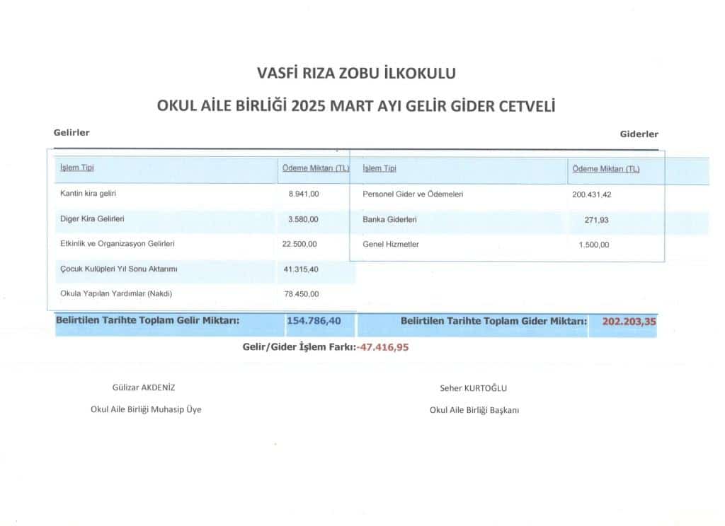 OKUL AİLE BİRLİĞİ MART AYI GELİR GİDER TABLOSU