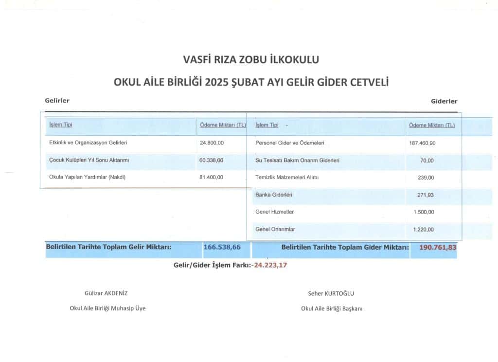 OKUL AİLE BİRLİĞİ ŞUBAT AYI GELİR GİDER TABLOSU